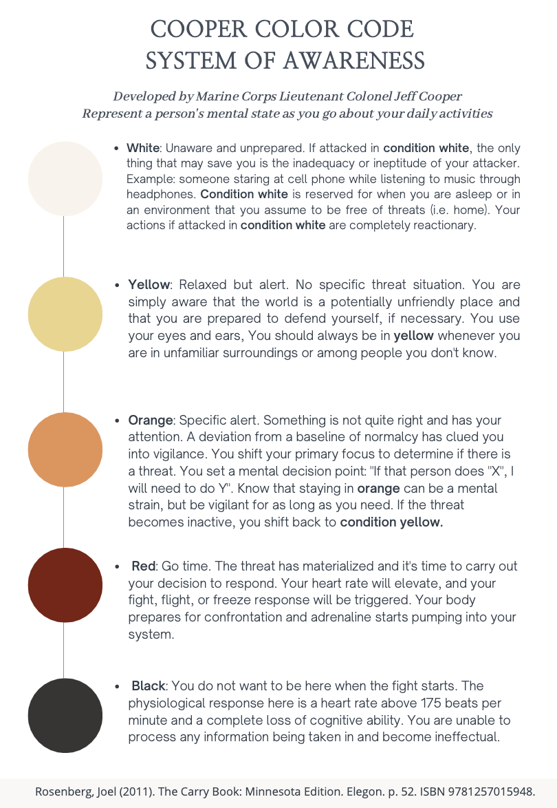 One of the most overlooked components of self-reliance is situational awareness. Now this gets talked about a lot, but it is often reduced to a few catch phrases while missing the true power it can hold. While situational awareness does include keeping your head up and paying attention, the real key is knowing what to look for. Recognizing danger BEFORE it strikes. The Cooper Color Code of Awareness is a great place to start and is a foundation for Module 1 in Program 62.